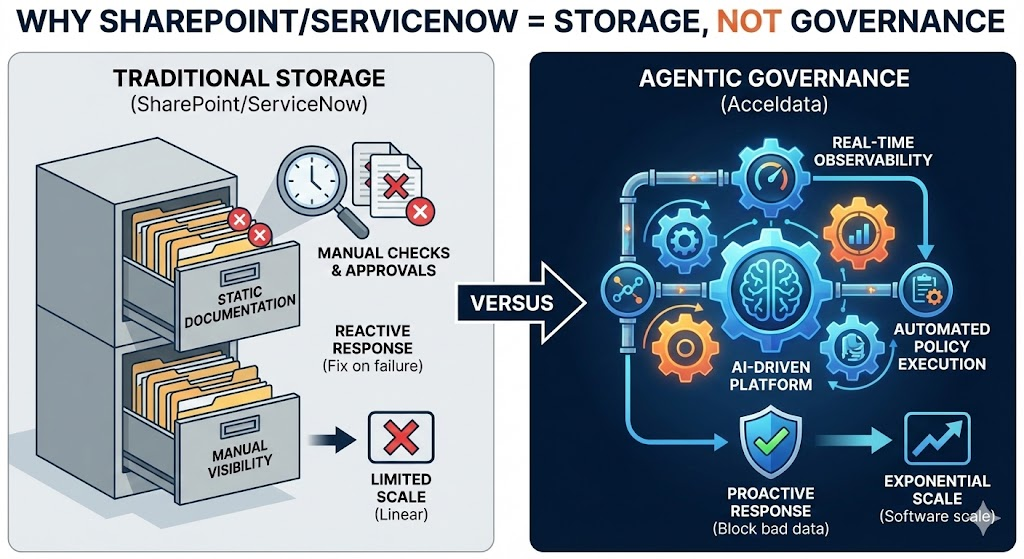 Companies struggle because SharePoint and ServiceNow are workflow and document management tools, not data governance engines. They lack the ability to connect directly to data pipelines, read metadata, or enforce policies automatically, leading to reliance on manual updates that quickly become obsolete.